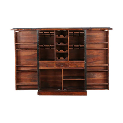 Crafted from the Indian Sheesham wood with unique natural wood grain finish in each unit, the Woodrow bar cabinet is a statement addition to your spaces. Multipurpose in all entertaining aspects, the bar cabinet exudes ample storage space with grooves and internal design tailored to keep your barware and glassware organised, safe and displayed in a stylish manner. The bar cabinet opens with two doors, forming an elongated table top that can be used to mixing and serving drinks.
