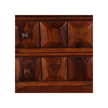 Crafted in Indian Sheesham wood, the Woodrow media unit adds warmth and a sense of traditional design with its natural wood grain finish and repetitive geometrical pattern carvings. The unit comes with ample open and closed storage spaces to store your knick knacks along with media essentials like cable, remote, and other miscellaneous items. Each product has different grain finish making each unit a unique one for you! Pair with the rest of Woodrow furniture collection to complete the look.