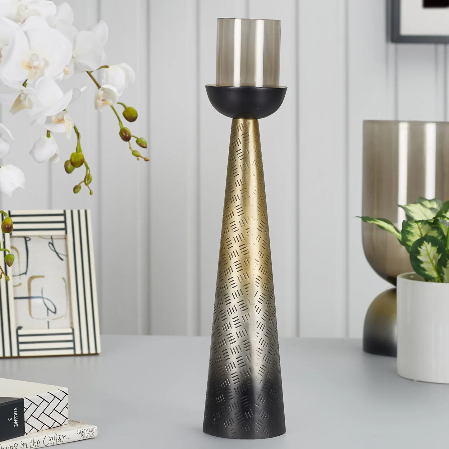 Zeus Iron and Glass Ombre Conical Candle Holder 10x47 Cm in Antique Gold & Black Colour
